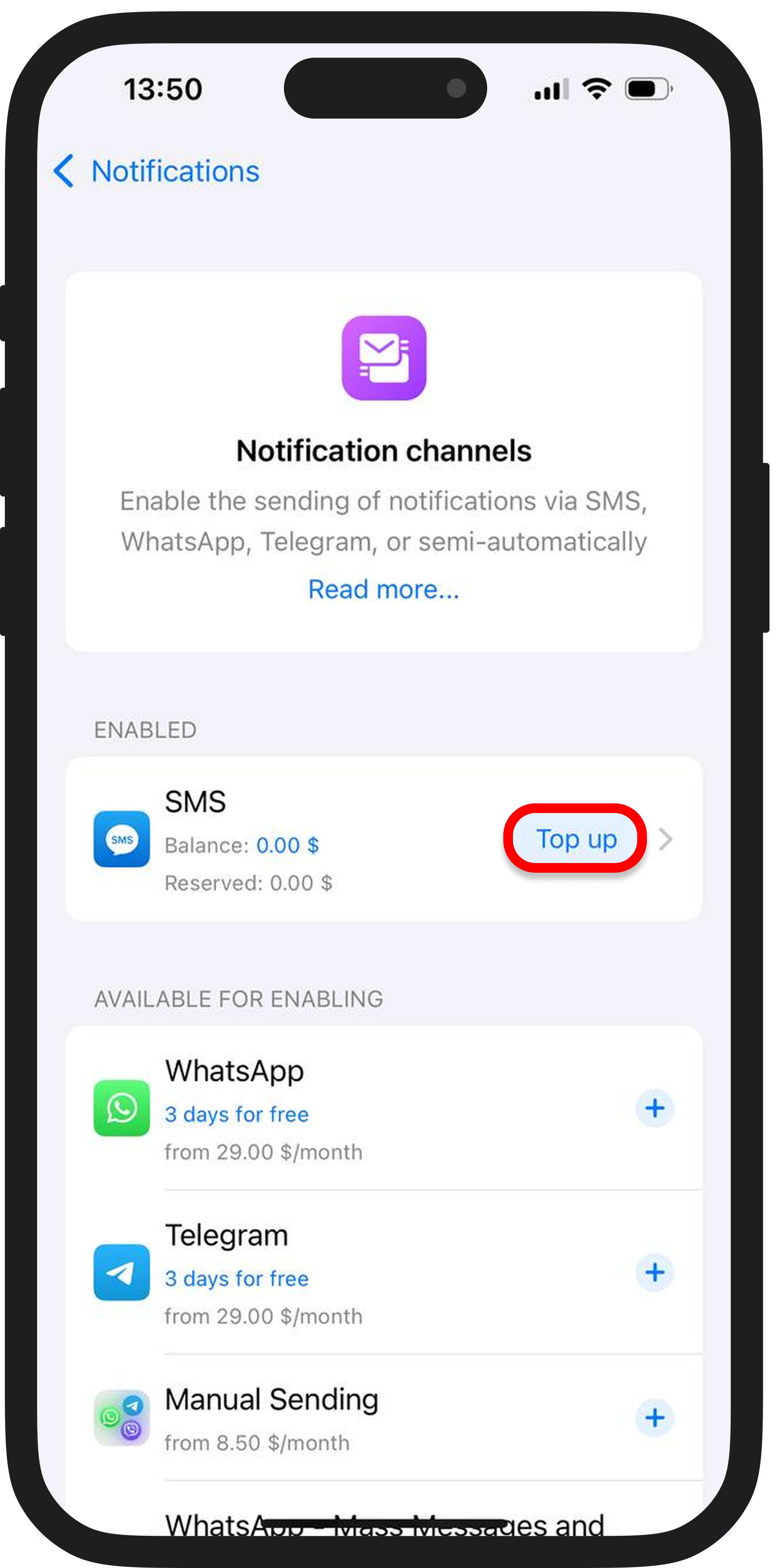 In the app: go to “Settings” → “Notifications” → “Sending channels” → “SMS” → “Top Up”