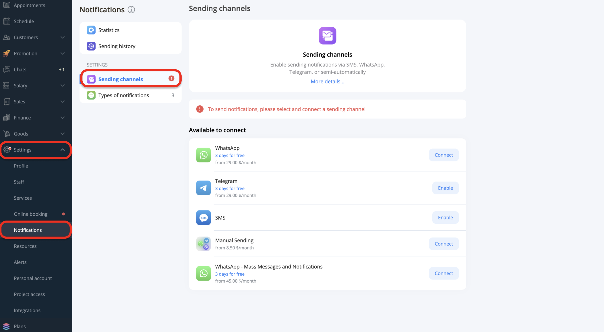 ⚠️ NB! To send notifications to your customers, you must connect at least one sending channel.